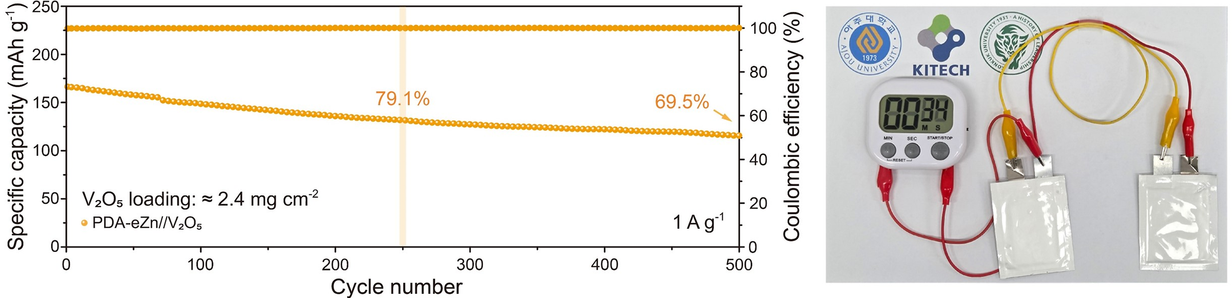 (왼쪽) 연구팀이 개발한 새 아연 배터리의 충·방전 반복에 따른 성능 변화 그래프. 1 A g⁻¹ 조건에서 500회 이상 충·방전을 반복한 이후에도 약 69.5%의 용량을 유지하며, 안정적인 쿨롱 효율을 보임. (오른쪽) 실제 제작된 파우치형 아연 배터리로 소형 전자기기를 구동하는 모습. 간단한 공정으로 제작된 배터리가 실제 기기 구동에 적용 가능함을 확인함