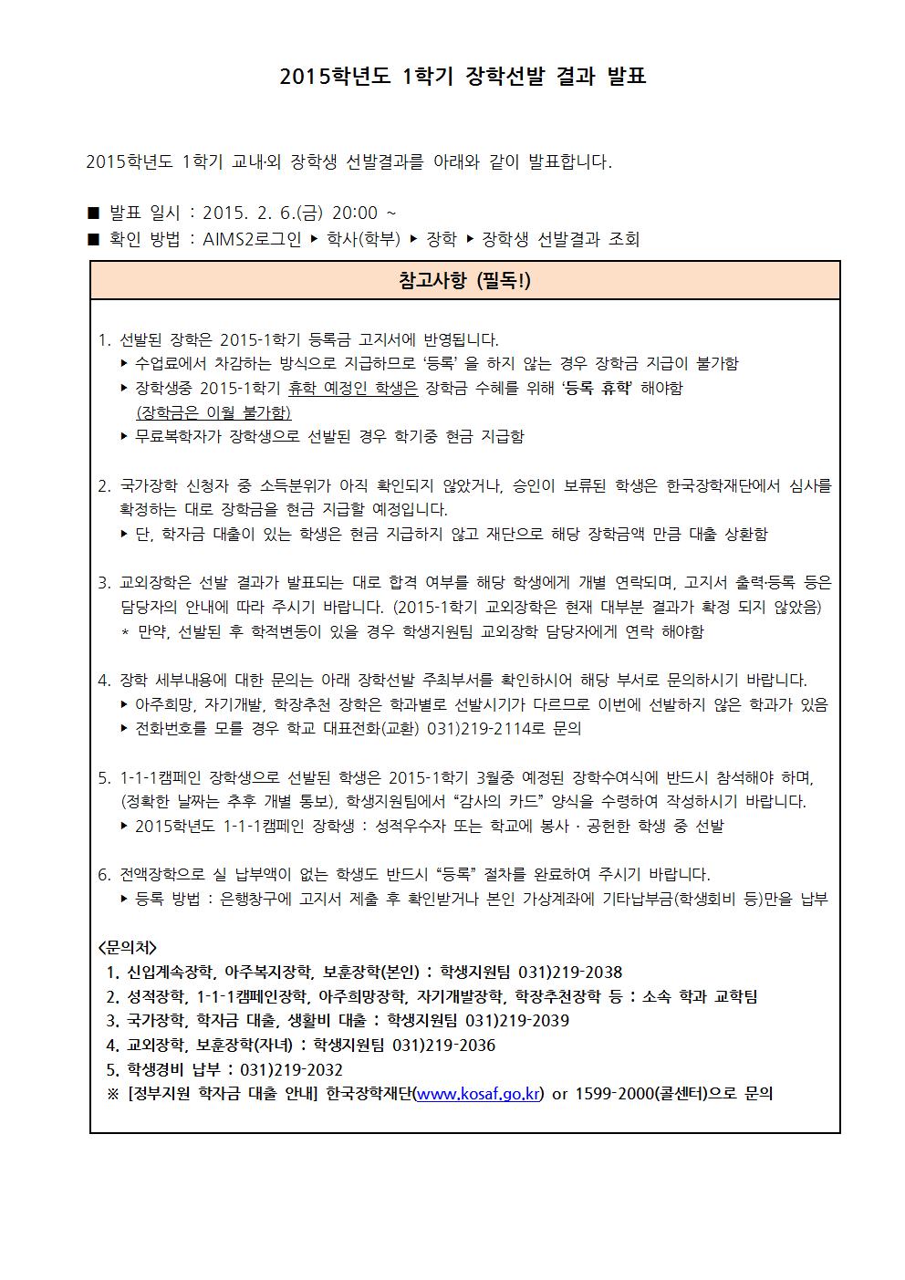 2015학년도 1학기 장학선발 결과 발표