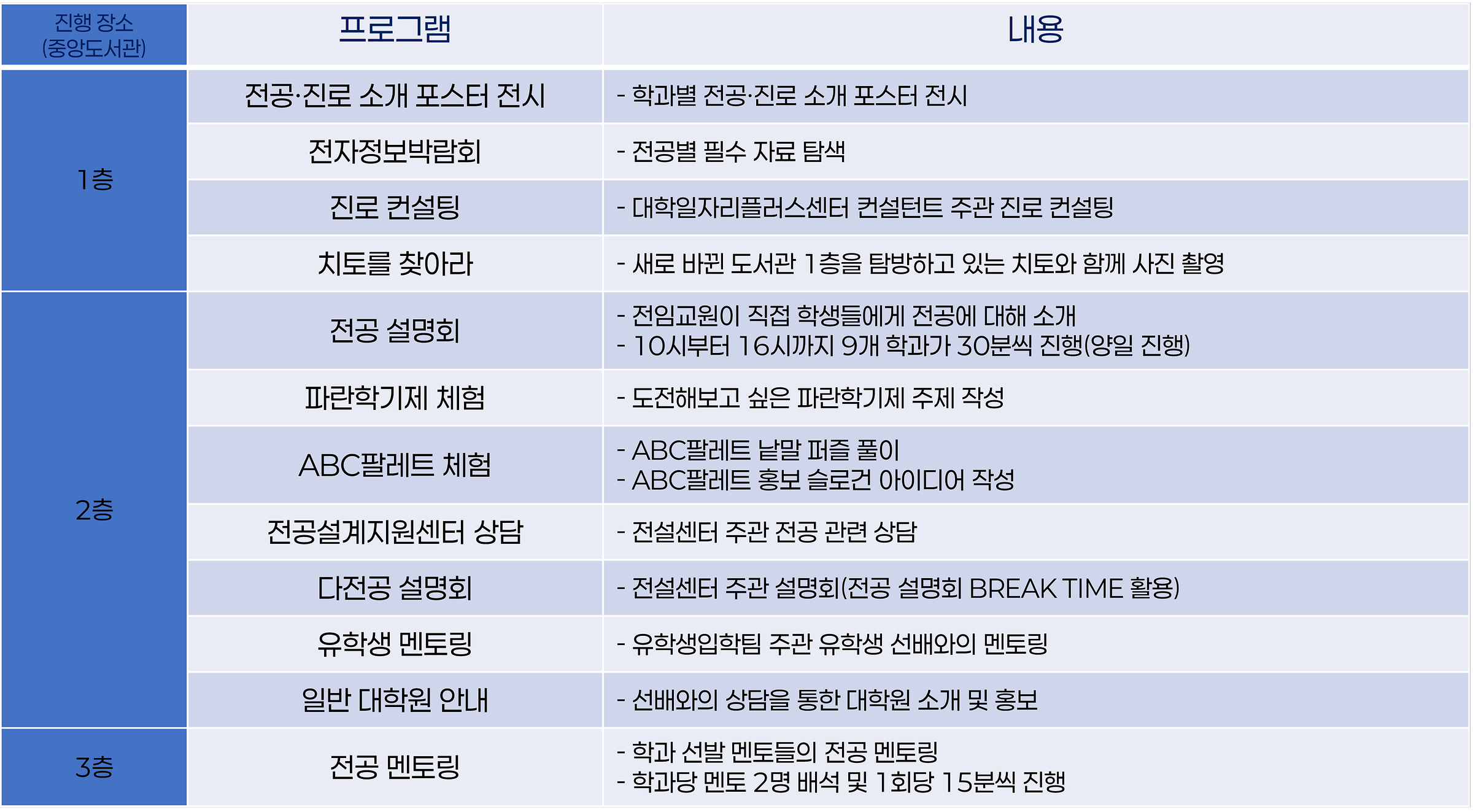 - 필수 프로그램: 전공·진로 소개 포스터 전시(1F), 전자정보박람회(1F), 전공 멘토링(3F)